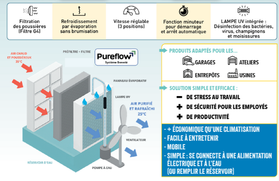Rafraichisseur d'air mobile idéal pour les garages automobiles, les ateliers, les entrepôts et les usines.